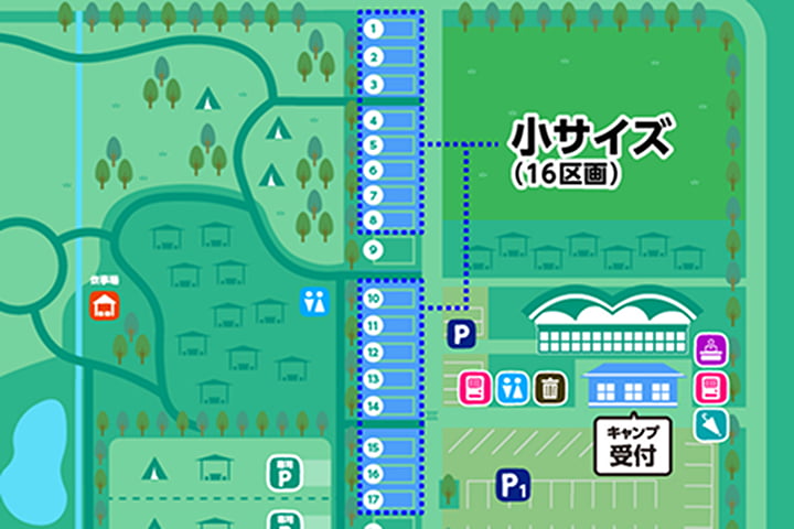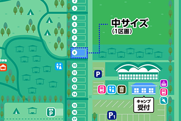 - チェックイン・チェックアウトは【P1横・キャンプ場受付】へお越しください。(施設マップはこちら)