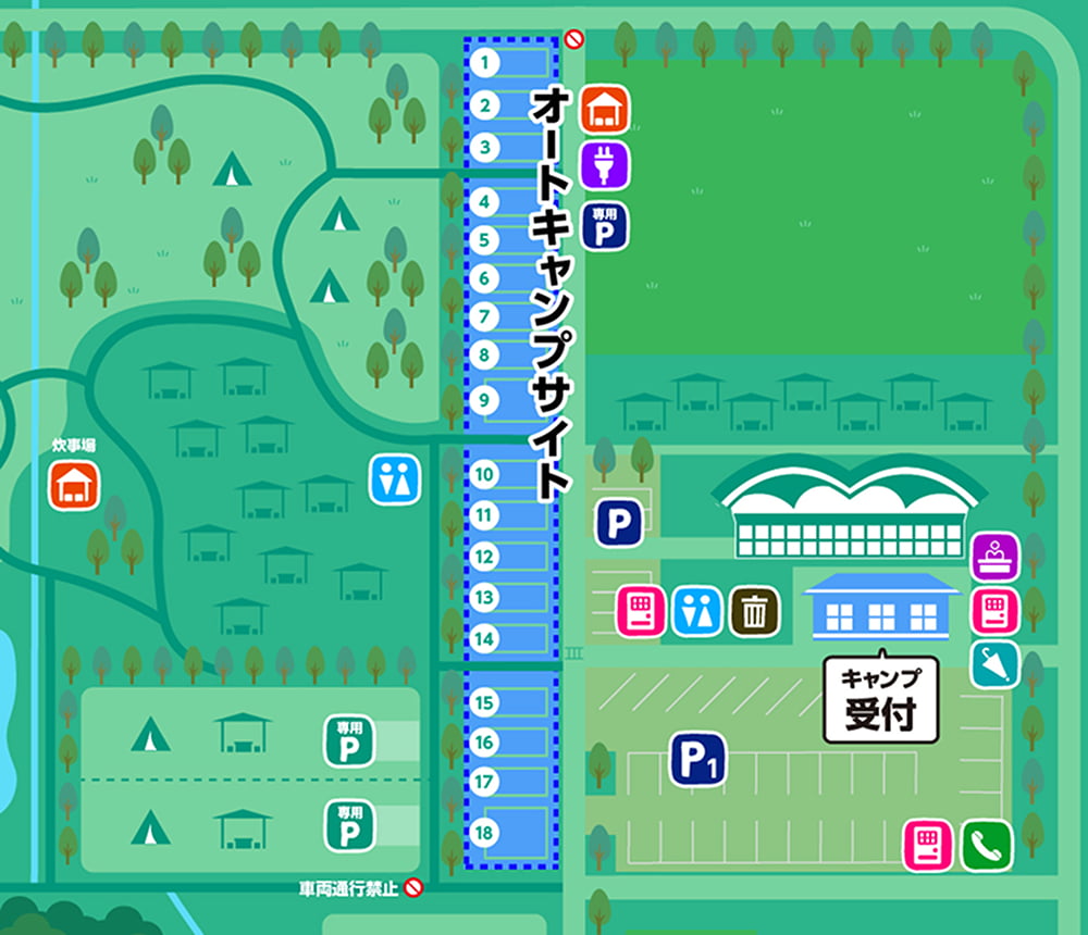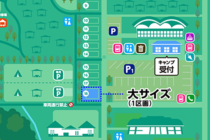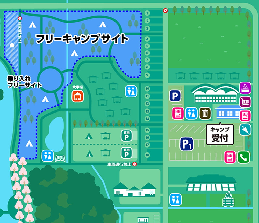 - 乗り入れフリーサイトは「車両1台+テント・タープ1張ずつ」を「1サイト」とカウントします。