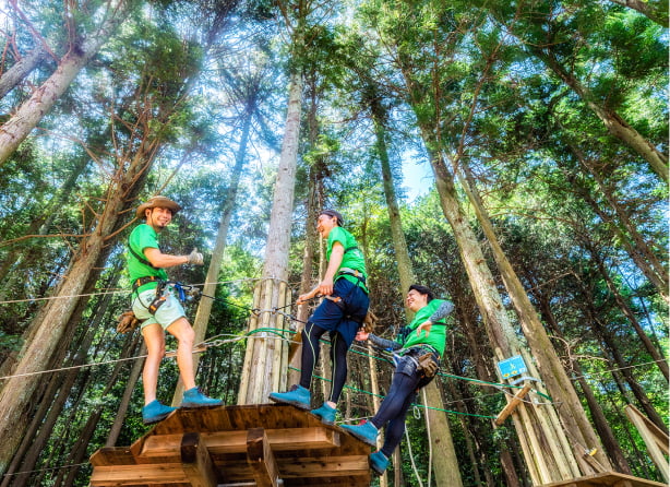 自然の森に作られたコースの高さは最大約9m!大人気のジップスライドは最長65m!