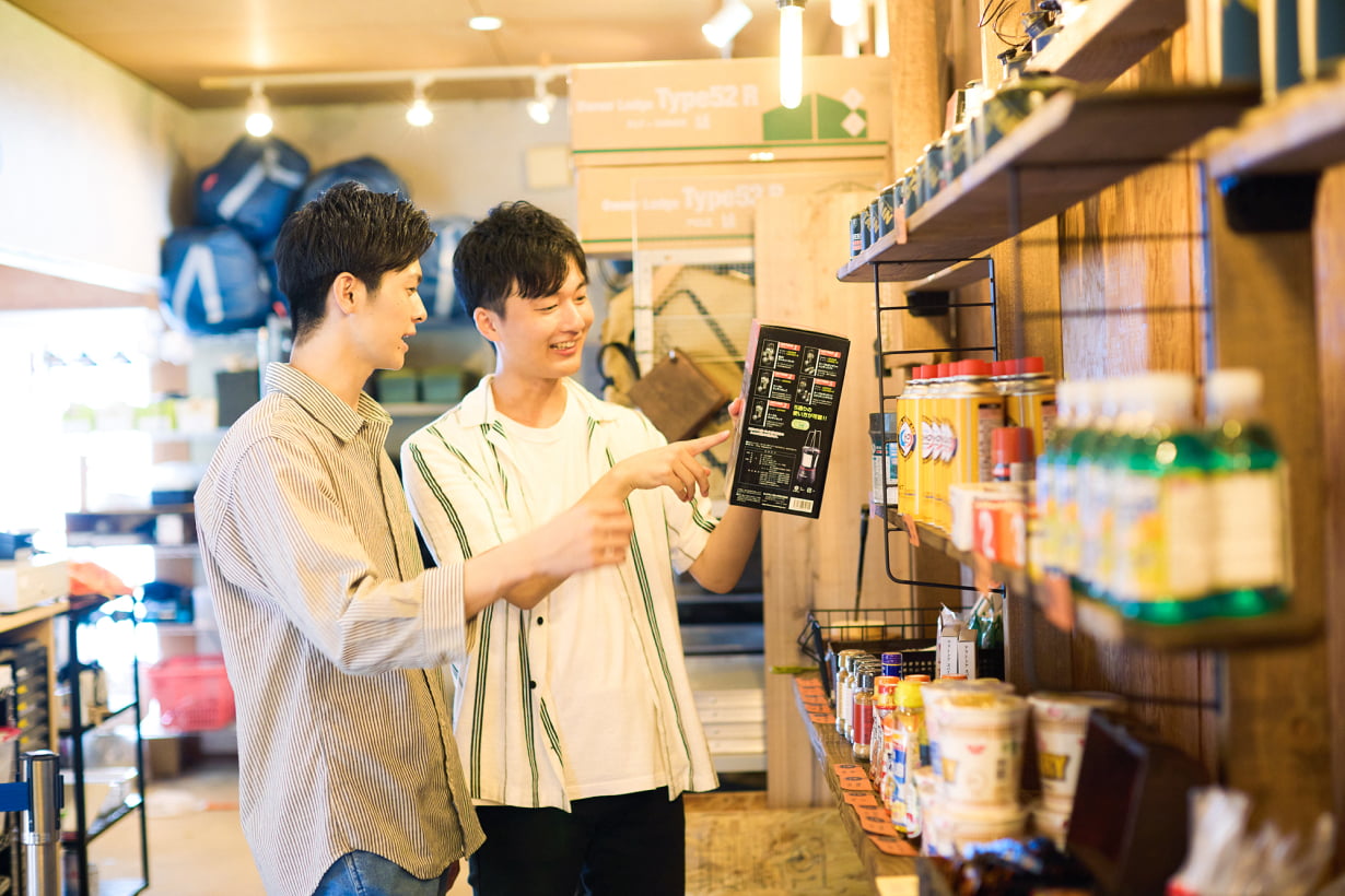 ショップ・レンタルでは、キャンプ道具を忘れた場合に役立つ道具や、軽食・ドリンクなどを用意しています。