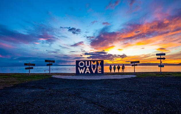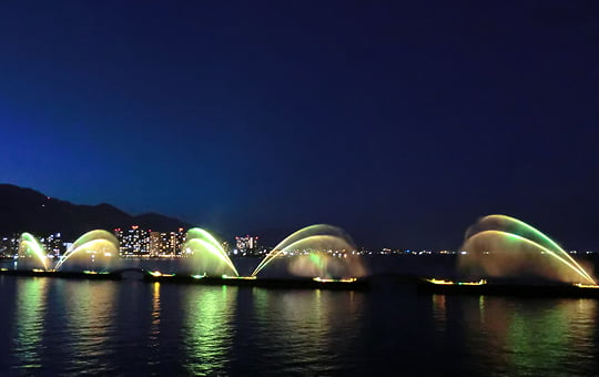 大津港沖の防波堤から噴き上がる、全長約440mの世界最大級の花噴水。夜はライトアップされ、琵琶湖を幻想的に彩ります。※現在運転休止中。