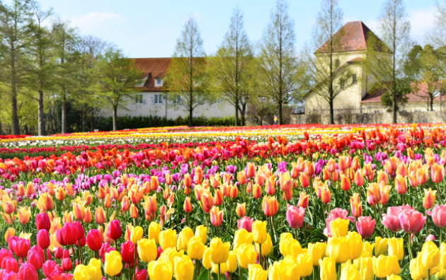バラとクレマチスや宿根草が植えられたイングリッシュガーデンです。「ひつじのショーン ファームガーデン」も大人気です。