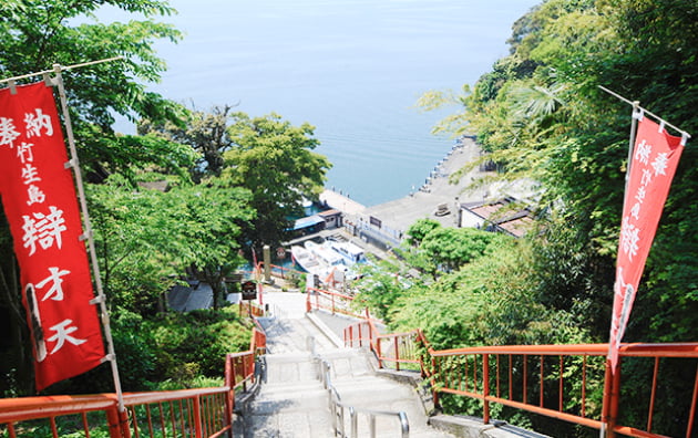 長浜市に属する周囲2kmの小さな島、竹生島。国宝の宝厳寺唐門や都久夫須麻神社本殿、重要文化財の宝厳寺船廊下など見どころ満載です。