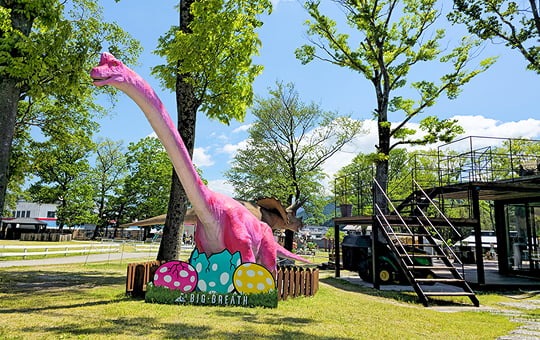 大きな恐竜が目印!屋内テニスやフットサル、スケボーパーク、動物ふれあい、アスレチックにBBQなど、多彩な施設を備えています。